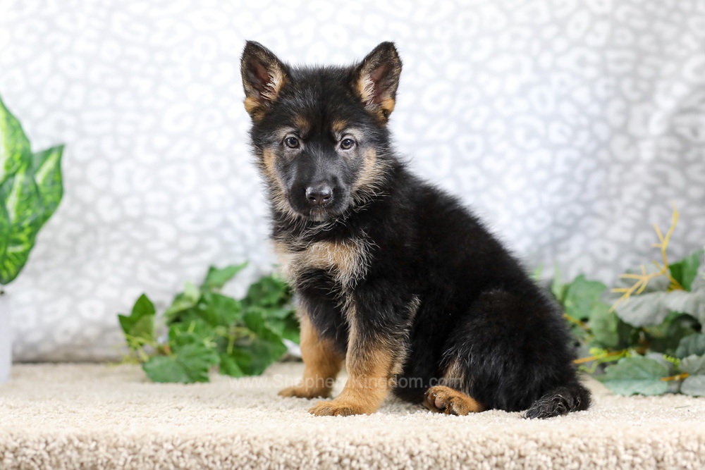 The sire Dominic is a handsome, long-haired black and tan with a confident personality and a very nice build. He is OFA Hip, Elbow and Heart Certifed. The mother Kasey is lovely sable-colored girl.